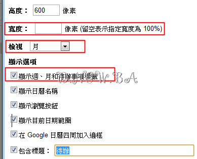 設定選項建議寬度第一次使用者以100%來做檢視,因為我們不知道太長的活動內容是否會影響版面;顯示選項也勾選顯示週月和待辦事項標籤。