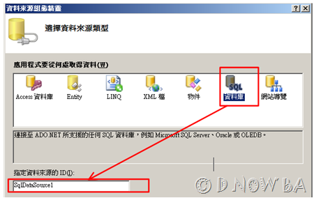 (2)這裡選擇SQL資料庫,從這裡也可以看到ADO.NET支援的連結類型包羅萬象,底下預設會有一個資料來源ID