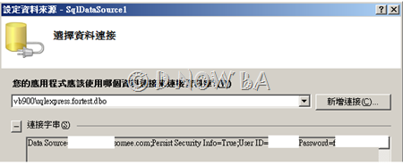 (3)第一次使用要建立「新資料來源」步驟會較多,這邊就略過與資料庫連結的步驟 ,大柢就是產生一個連接字串(裡頭包含DataSource UserID Password),下回使用連結時,因為產生過一次,所以若使用同一個資料庫就沒有這麼繁瑣