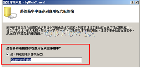 (4) 設定完連接後,會以字串的方式存在應用程式組態檔中,也就是在開發網站根目錄下的Web.Config這個XML檔案裡。