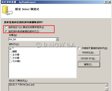 ●指定自訂SQL陳述式或預存程序:如果是要關聯(join)多個資料表,那麼就要選這個,相對而言這個方式比較多元。