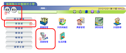 如下圖,領域成績統一由教務處負責管理,老師在登入系統後,進入教務處①的成績管理②中即可進行操作。